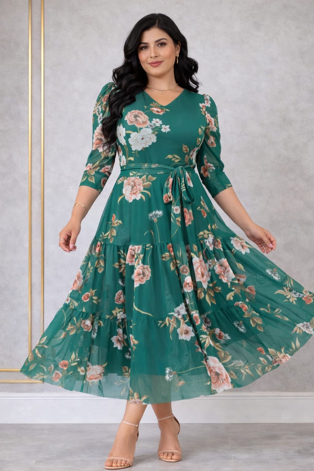 Tecido tule estampado com elastano, com faixa na cintura e forro.